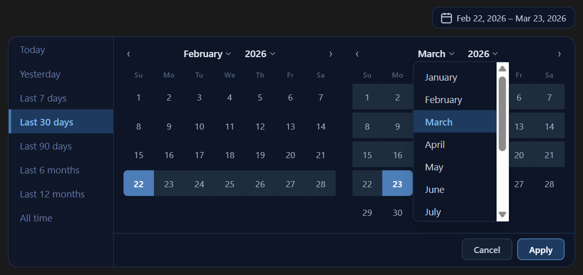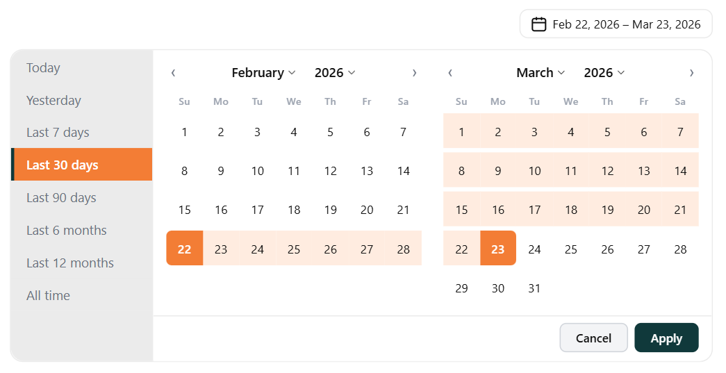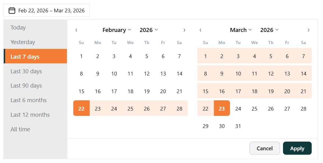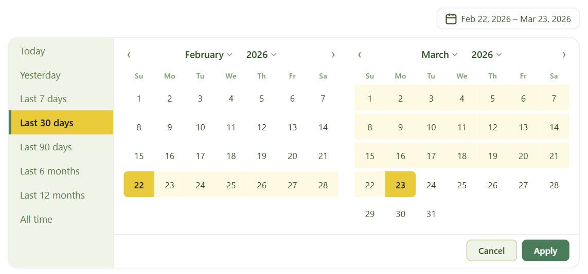 - Eight relative date presets: Today, Yesterday, Last 7 days, Last 30 days, Last 90 days, Last 6 months, Last 12 months, and All time
