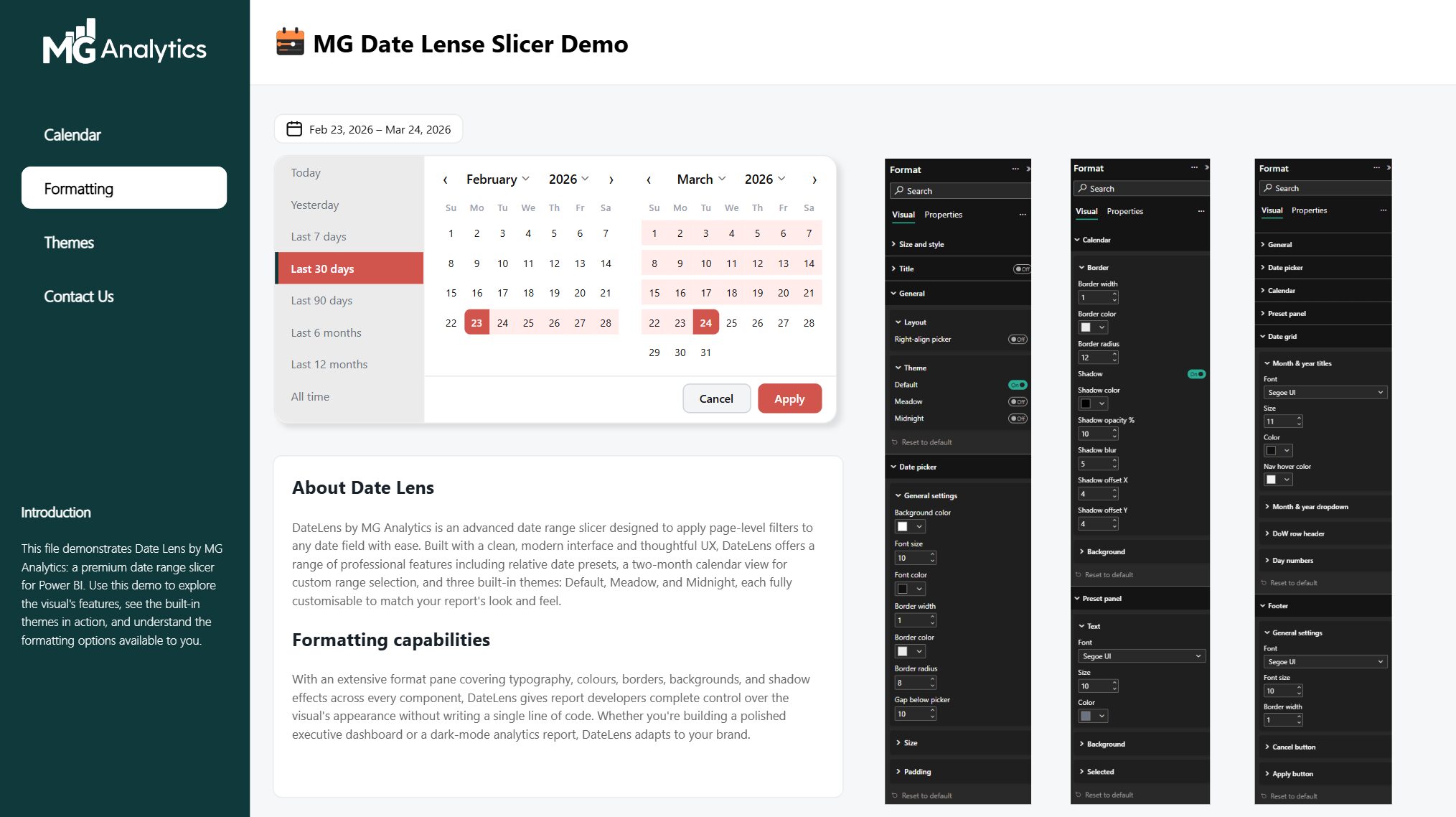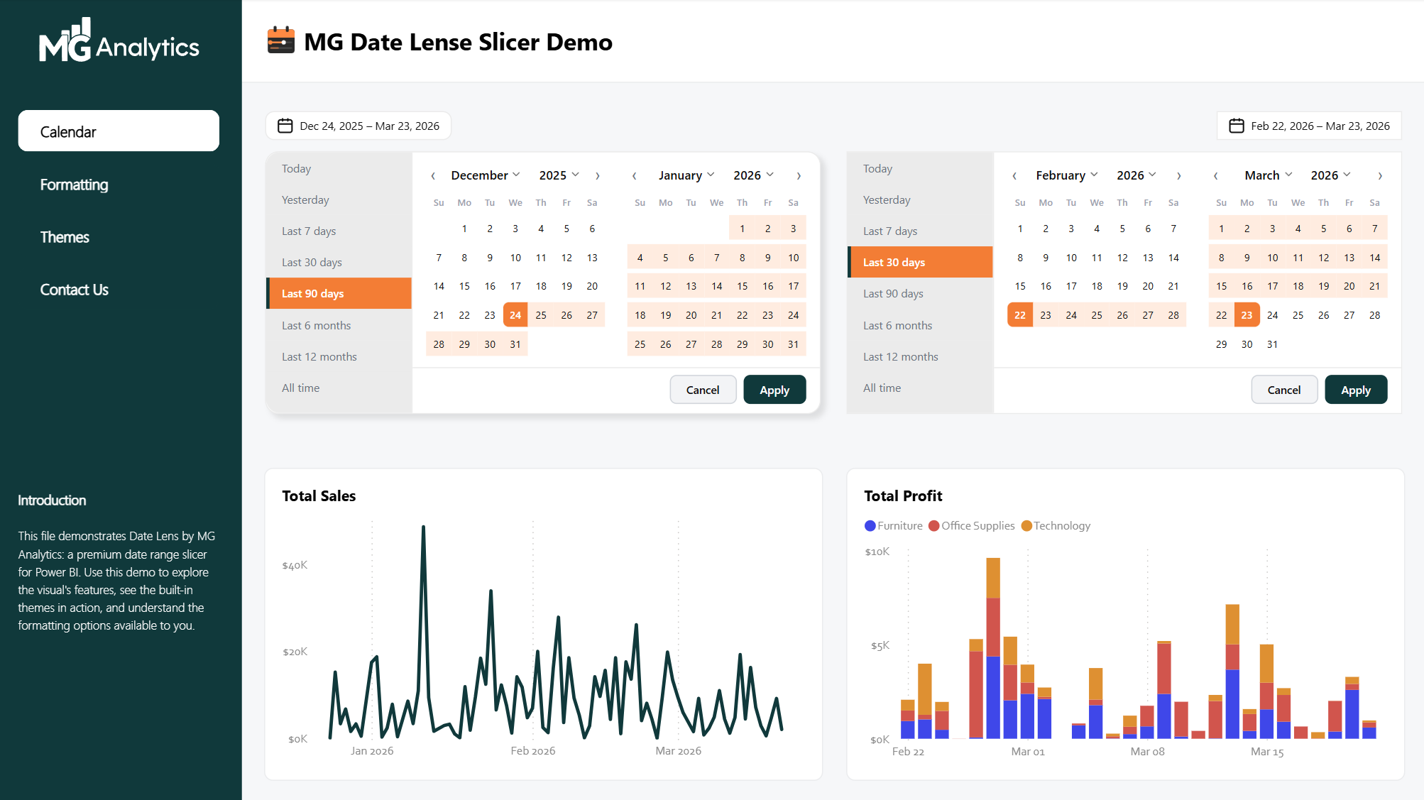 Bring a new level of precision and polish to your Power BI reports with Date Lens: a premium custom date range slicer built from the ground up by MG Analytics.
